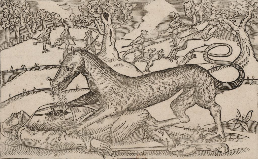 I would urge that particular attention is paid to the dragon’s topmost head; the least prominent in the painting, it is nonetheless the most important to my purposes. The oblique angle Goltzius gives us of this head offers a more three-dimensional view of the monster’s anatomy. With its deep, rectangular muzzle and protruding tongue it suggests the lupine more than anything else. A scaled, wolf-like head atop a writing serpentine neck. This transposition of ‘undesirable’ animal traits onto dragons fascinates me, as does the reverse; when draconic or reptilian traits are ascribed to real animals, to highlight their ‘unnatural’ status as enemies of Christian humanity. As an example of this, I leave you with this truly bizarre depiction of an actual man-eating wolf that hunted the population of the town of Cinglais, France from 1632. Free from context, would you identify this as wolf or as a dragon? And if you were a French woodsman or washerwoman confronted by it on a misty morning, would such a distinction even matter?
